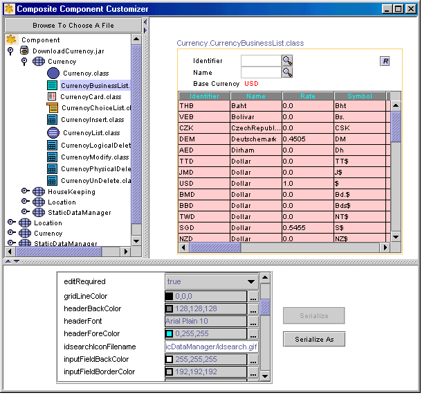 All components in BitSlice are customizable by the user. Customization can be done by changing the values of customizable properties associated with a given component. The components may be used as java beans and/or class libraries. If you are using an IDE for java, the java beans can be integrated into your IDE and can be customized using the customization mechanism provided by your IDE. Alternatively, BitSlice comes with its own customizer that is a stand-alone java application and this can be used to customize your component. Given below is a snapshot of the BitSlice customizer being used to customize the ‘Currency Business List’ component: