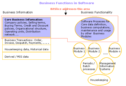 On the Processing / Functional side there exist modules for software processes that deal with the definition, generation, validation, maintenance and business computations on all the various partitions of Business Information.