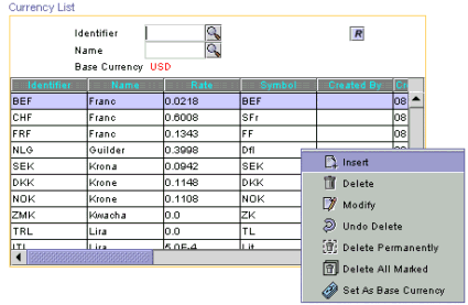 Business Lists provide a tabular view of Business Information retrieved at run-time from the database. These can be used to view and operate on Core Business Information such as Credit policies, Currency rates, Delivery terms, Credit Card companies, Banks, etc. Given below is a Currency Business List: