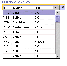 Data selection lists are multi-column Combo lists packaged with Business data that is retrieved at run-time from a database of Core Business Information. These can be directly used on various Business documents entry programs such as Purchase Order, Sales Order, Invoice, etc. in order to make selections on sample Business data. Given below is a Currency Selection List: