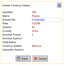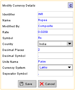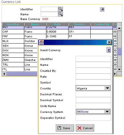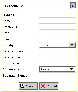 Data Maintenance components can be used to make changes on Business data consistent with business rules and policies. These components would often be used in conjunction with Business lists or other view / transaction modules where changes are made against the backdrop of some other activity. However, they may also be used stand-alone. Given below is the currency insert component: