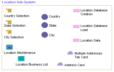 Sub-systems are bundles of closely related Components. Each component in the sub-system may be customized according to the requirement of the unit in which it is used. Different customized versions of a component may be used in different application units.Given below are the components that form the Location Sub-system.